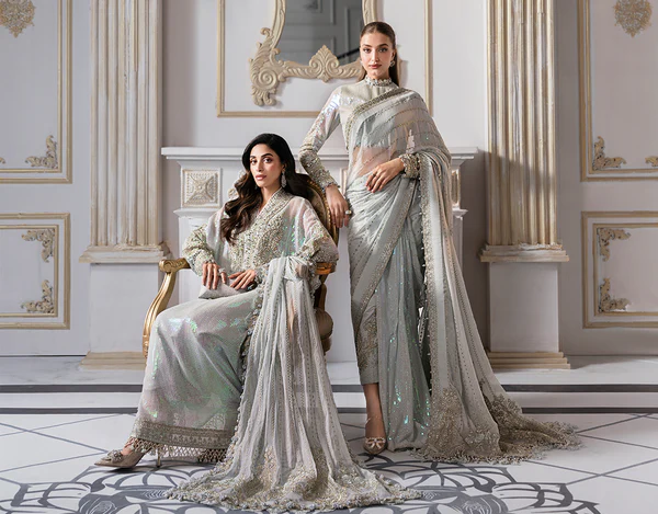 This collection is a celebration of craftsmanship and artistry. Each piece in this collection features an exquisite embroidered chiffon front bodice, adorned with luxury hand embellishments that reflect the rich heritage of festive wear. The intricate detailing, including 3D flowers, mukaish work, and sparkling diamantes, adds a touch of glamour that is perfect for any occasion.