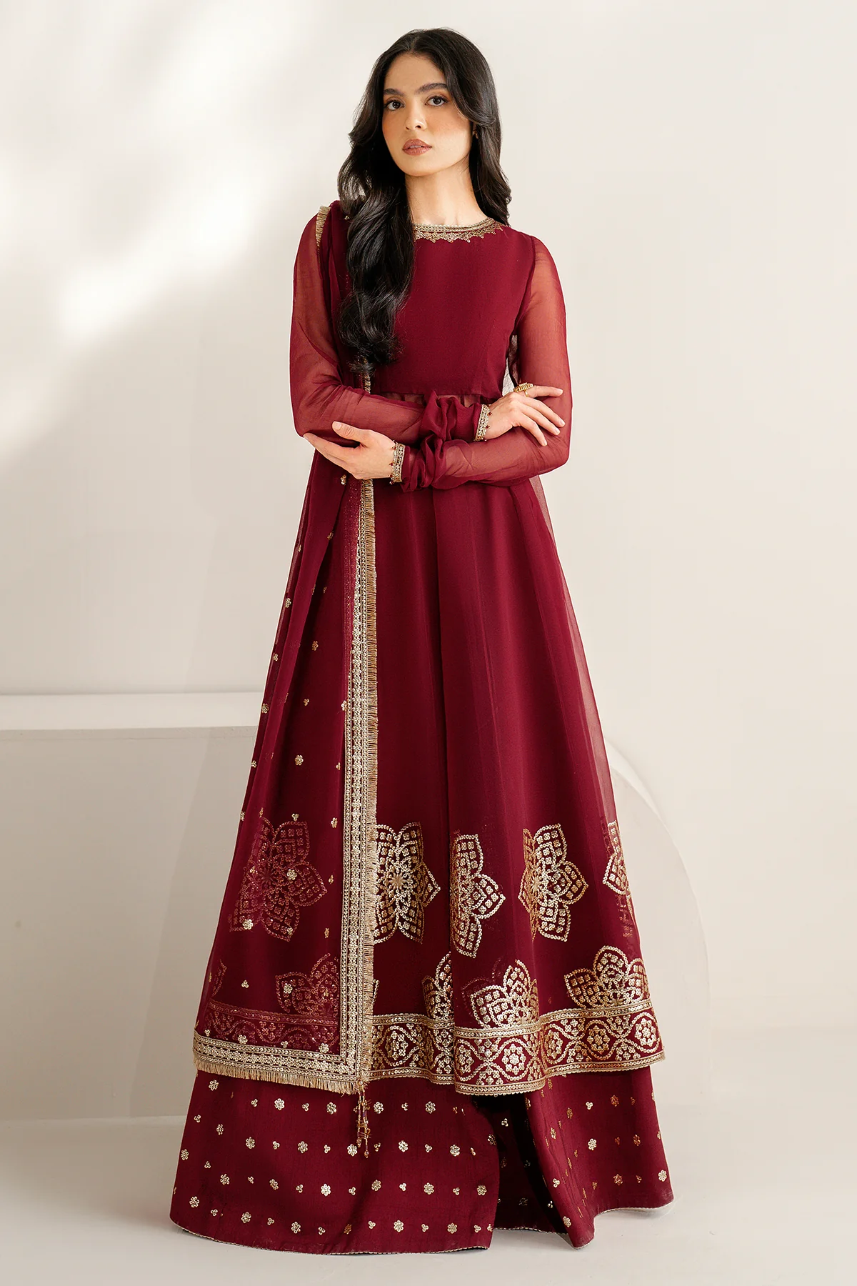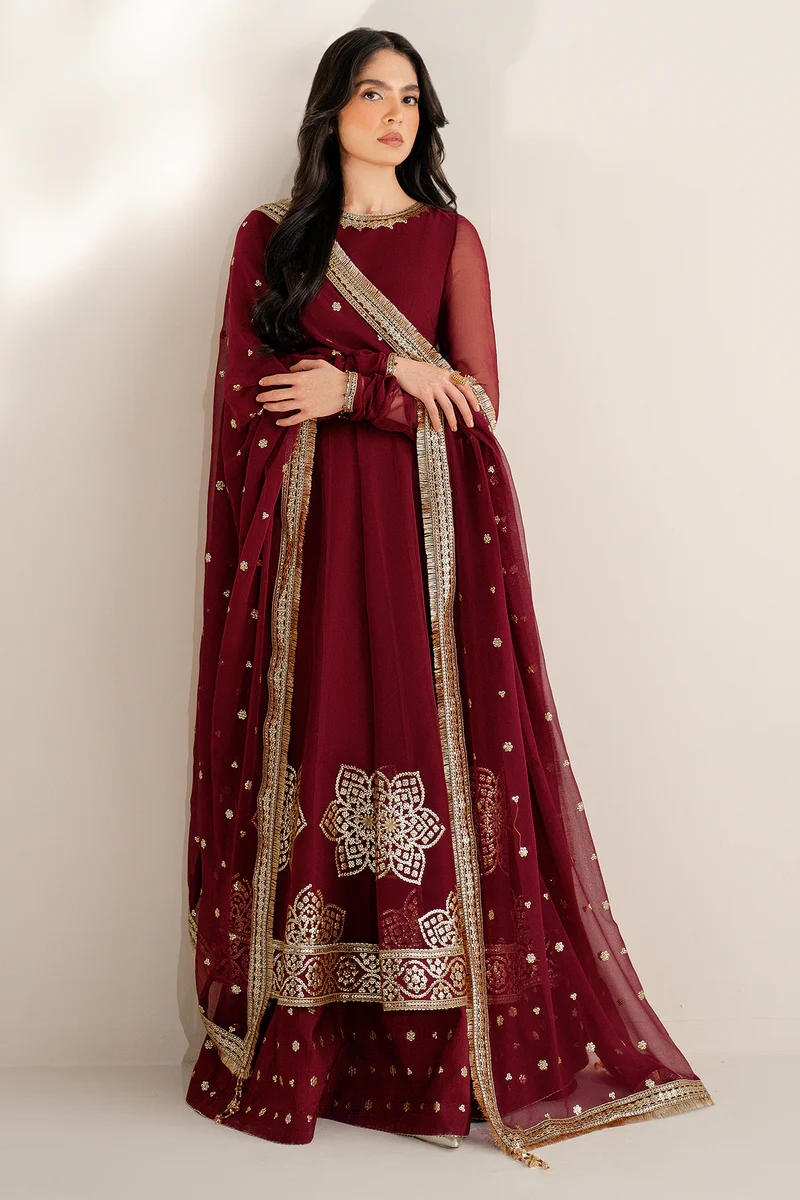 This exquisite embroidered chiffon ensemble combines delicate craftsmanship with luxurious materials. Featuring an embroidered chiffon front yoke, detailed embroidery on the front and back panels, and finely stitched borders on the sleeves, dupatta, and bottom, it offers a refined and elegant look. The dyed chiffon sleeves and back yoke provide subtle contrast, while the dyed raw silk bottom adds richness and texture. Perfect for occasions that demand sophistication and expert tailoring.